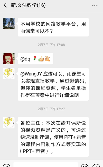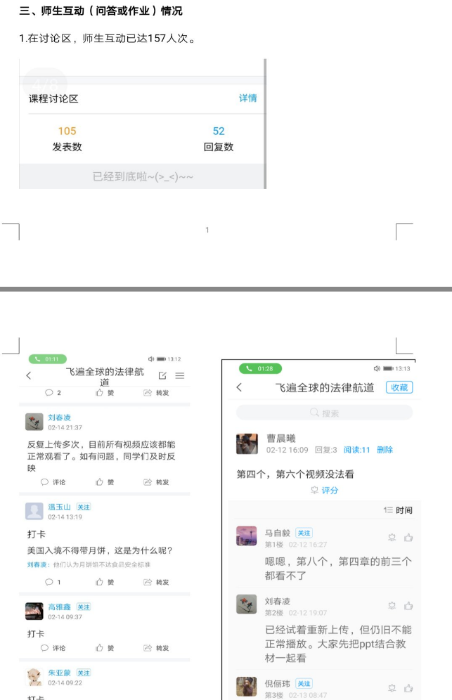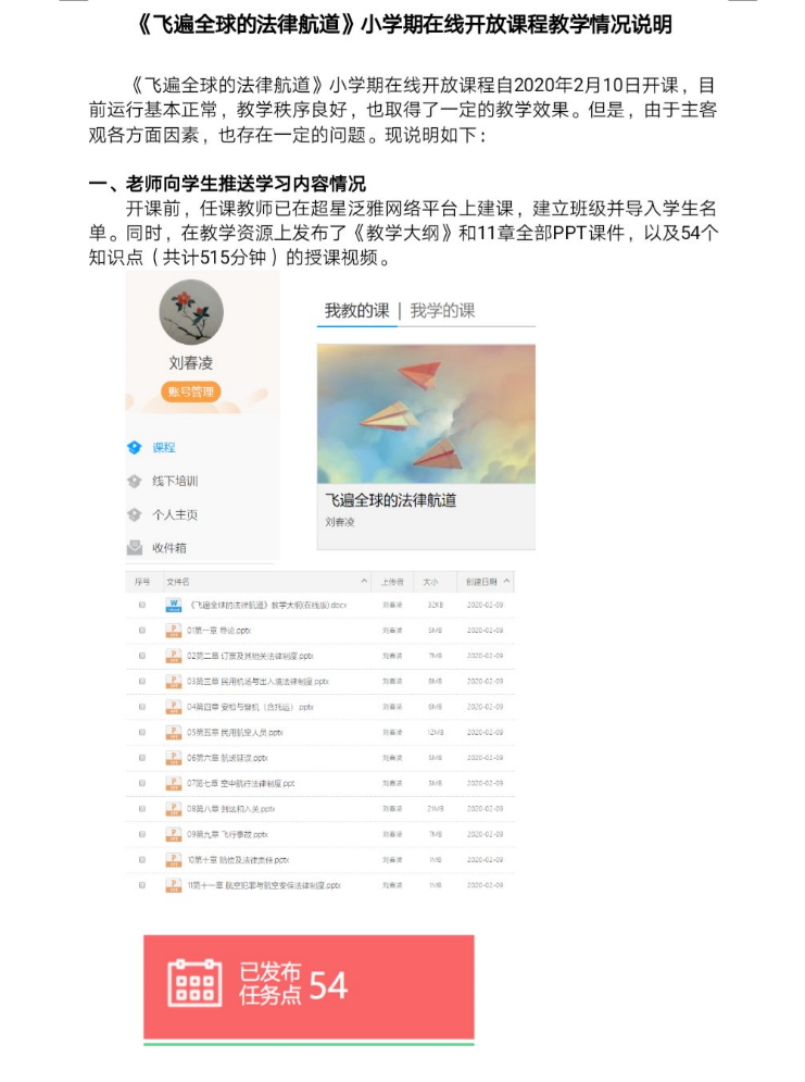 在学院的要求和指导下,刘春凌老师的《飞遍全球的法律航道》寒假线上小学期在线课程已如期并顺利的进行。为了让同学们能够有更好的学习体验,刘老师把作业、公告、PPT等在“超新星”发布;课前10分钟在“班级微信群”发布上课提醒;用“钉钉视频会议”进行授课;……“钉钉视频会议”+“超新星泛雅平台”+“微信群”结合的模式被刘老师熟练应用于线上授课,保证了授课、师生互动、课程测验有条不紊的进行。老师和同学们在线上学习的同时,也总结出一些需要解决的问题如:平台容量有待增加、视频清晰度有待加强。相信随着平台和课程的不断优化,以后的课程刘春凌老师会更成竹在胸。