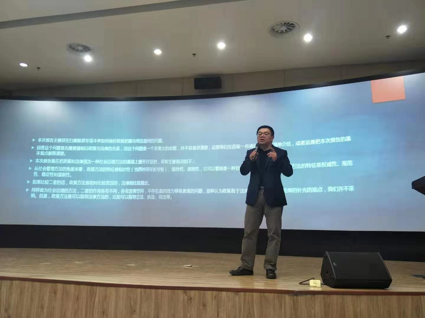 袁雪老师从2017开始参与由教育部和中央政法委组织的“双千计划”,到郑州市公安局犯罪侦查局法制处副处长,结合两年来的工作和多年的教学经验从法律角度分析了何为黑恶势力,身边的黑恶形式以及在对待黑恶势力如何做好政策把握与司法适用的问题。他认为当下黑恶势力的具有有组织性,经济性,暴力性和非法控制,并对现有常见的形式如黑120,黑保安,黑物业,黑网贷等进行分析和讲解。为同学们甄别和远离黑恶势力提供指导。