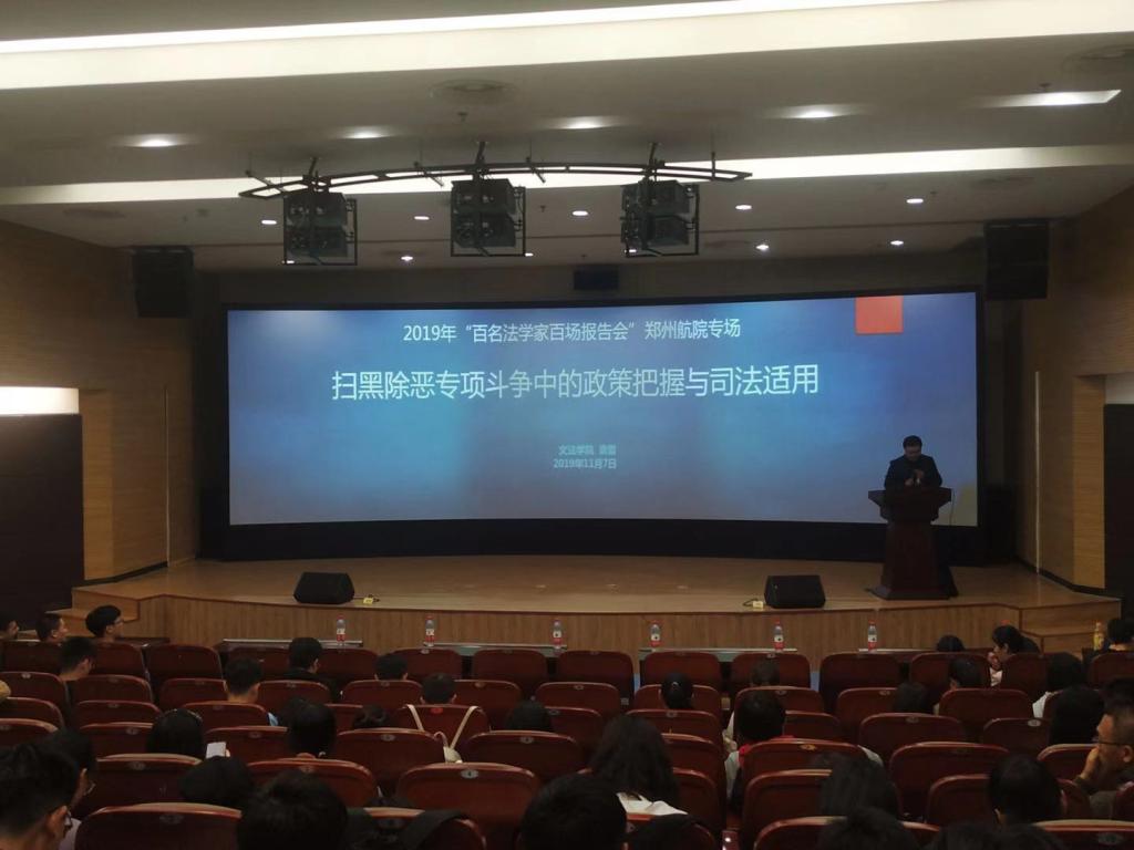 11月7日晚7:30,2019年郑州航院“百名法学家百场报告会”第二场在我校图书馆第二报告厅举行。报告会邀请河南省法学会刑法分会理事,河南国基律师事务所刑事部主任,best365中国官方网站法学系刑法学讲师袁雪作题为《扫黑除恶专项斗争中的政策把握和司法适用》的讲座。全校近200名师生到场聆听。