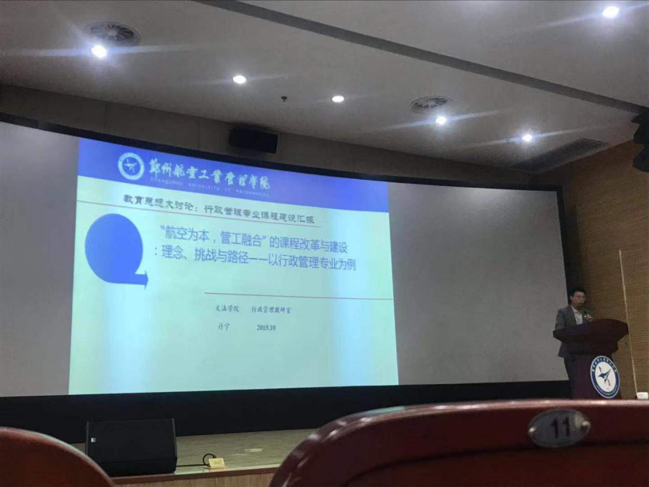 首先上台的是行政管理教研室的计宁老师。他报告的核心内容是以当下全校开展的教育思想大讨论为契机,深入思考如何将课程建设与学校“航空为本,管工结合”的特色骨干大学建设目标有机结合。他从课程改革的核心理念、面临的挑战以及对课程建设未来的构设三个维度展开。计老师认为课程理念变革无论是从国家层面、学校层面以及专业自身发展层面都迫在眉睫,特别当下行政管理专业在全校、全省都是处于一个发展劣势的严峻形势,未来专业发展需要亟待有革命性、创新性的课程建设思路与行动方案,才能够在未来的人才培养、专业发展与学校发展的目标形成共振与合力,为专业自身建设赢得足够的竞争力。