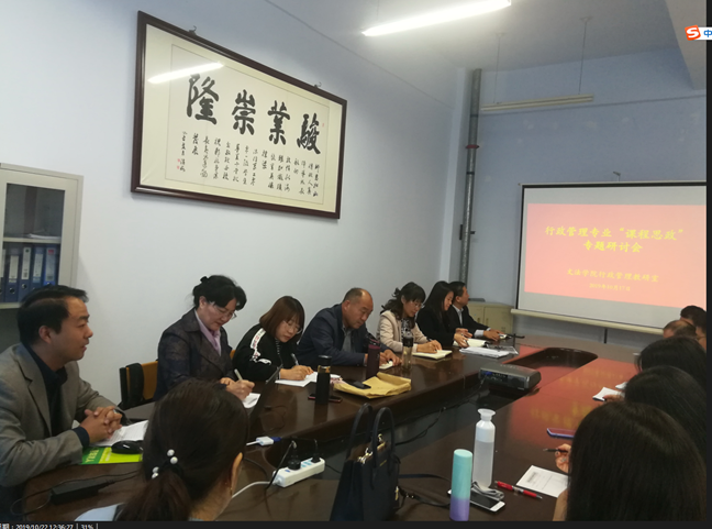 为深入开展“不忘初心,牢记使命”主题教育活动,落实“立德树人”根本任务,2019年10月17日下午,best365中国官方网站行政管理教研室在05B407召开了“课程思政”教学专题研讨会。学校教学督导专家、best365中国官方网站全体党政领导班子、行政管理教研室全体教师参加了会议。