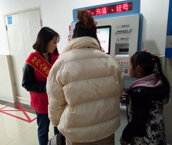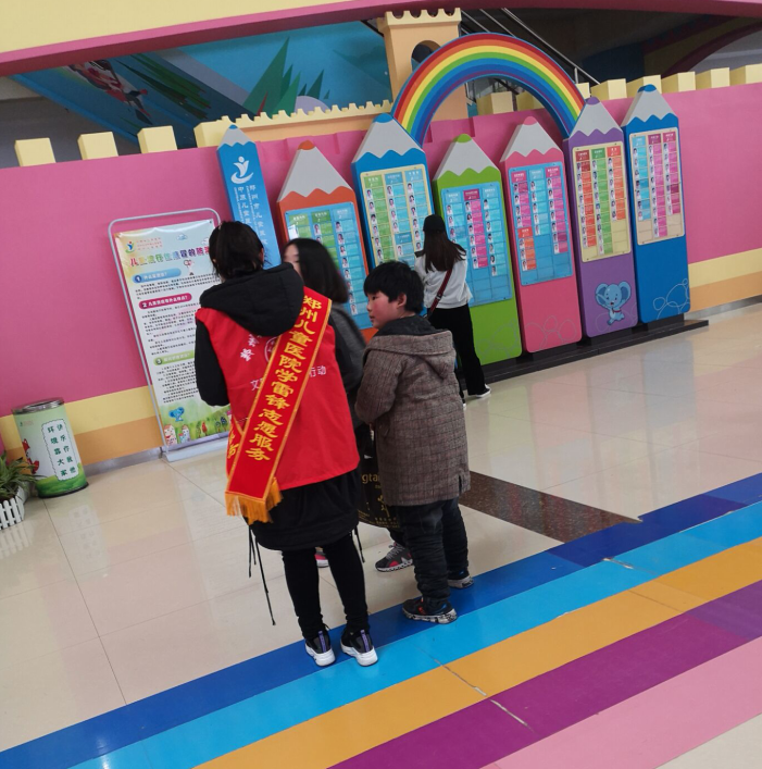 上午7:00,志愿者们在中心广场集合完毕,在经过半个小时的车程后,到达郑州儿童医院。上午八点,志愿者们听从总服务台工作人员的分配,分别有序的在个个楼层个个区开始了志愿活动。