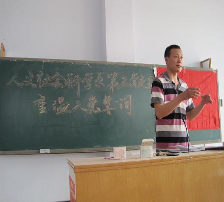 活动由人文社会科学系学生第三党支部书记刘敏主持,他首先就这次活动的意义给大家进行了详细的说明,他说我们要恪守我们的承诺,永远跟党走;其后在神圣庄严的党旗下,他引领所有党员高举右拳,重温了入党誓词;最后,他告诫所有党员要时刻牢记党的宗旨和精神,不忘党员身份,永葆先进本色。