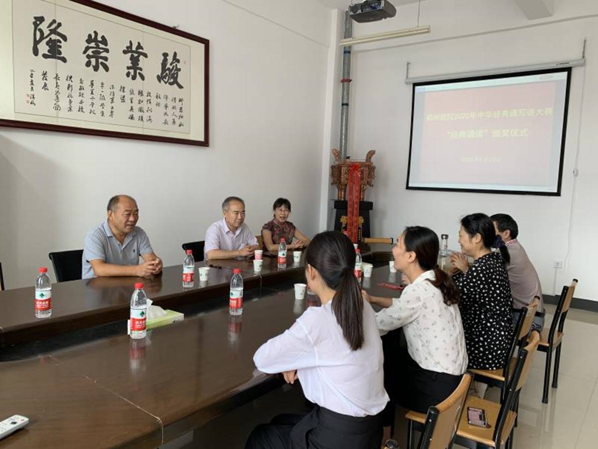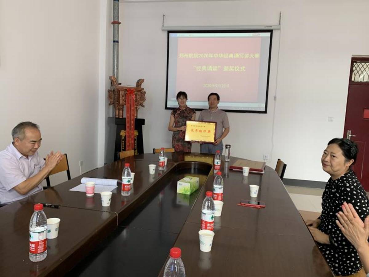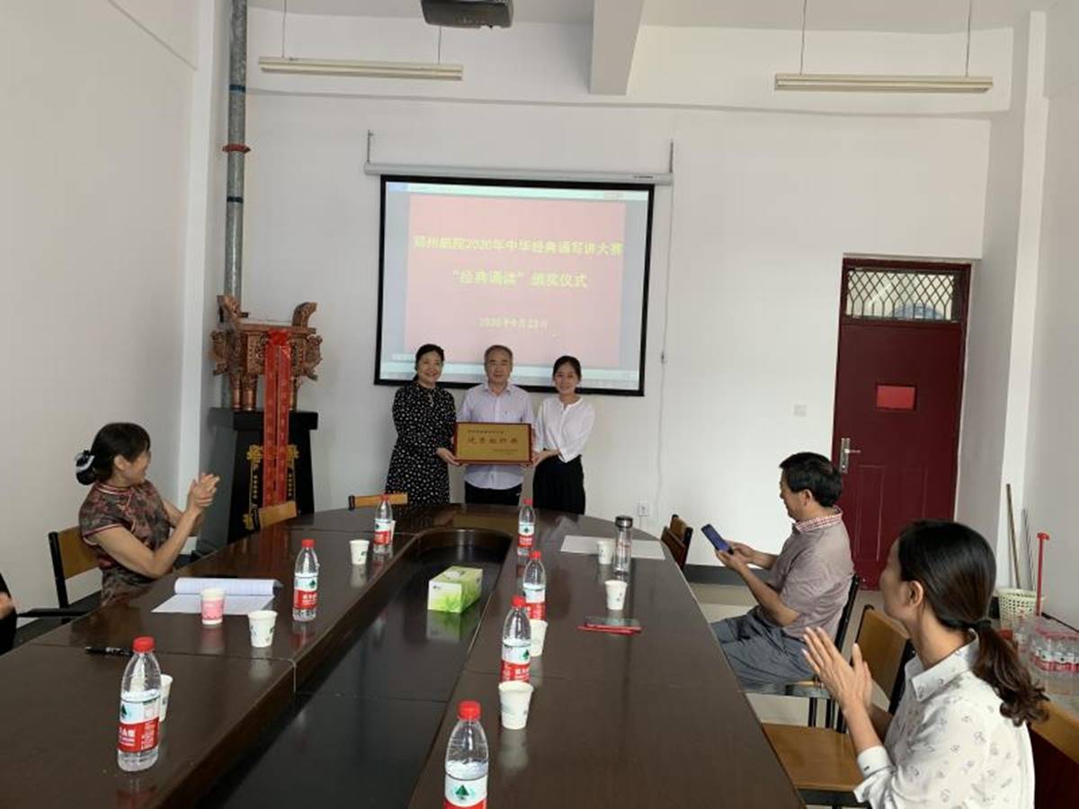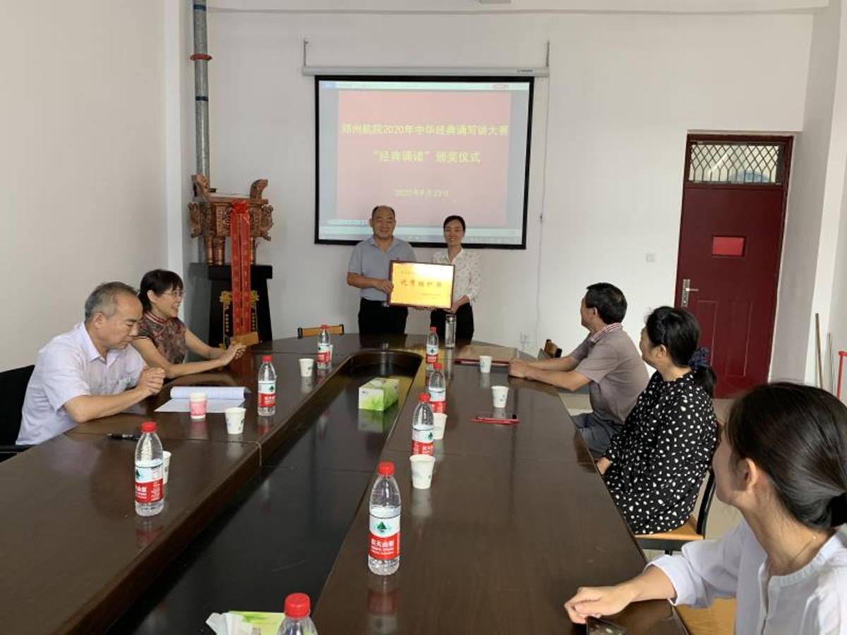 9月23日,郑州航院2020年中华经典诵写讲大赛“经典诵读”颁奖仪式在best36505B407会议室举行。学校教学质量管理中心主任朱杰堂、院党委书记路玲、院长邢培泉以及获奖单位代表出席。