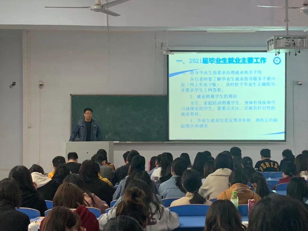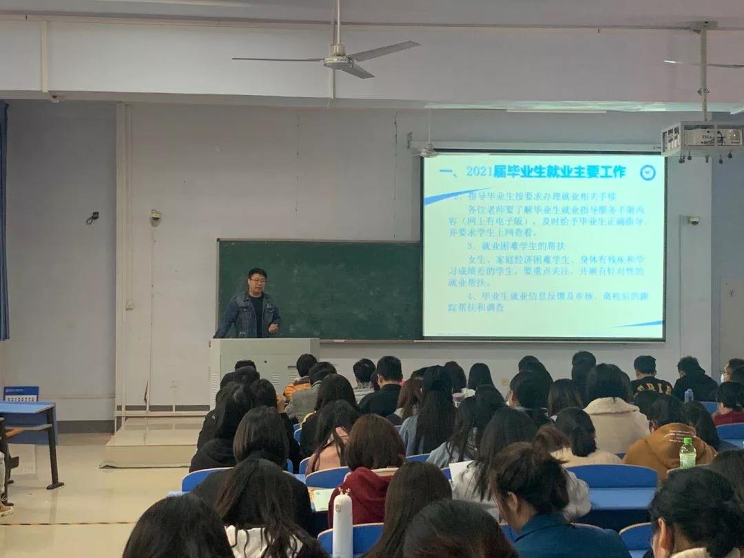 在第一环节2021届毕业生就业主要工作中,刘朋鑫指出:随着新学期的开始,秋季校园招聘已经开始,每个人都应重视起来,学生应多加关注学校官网以及学校微信公众号发布的就业信息,对相关公司进行了解并进行选择,根据自身专业以及自身特长,选择符合自己的公司参加其宣讲会进行现场应聘。另外,刘朋鑫针对学校就业官网进行了详细的介绍,对其相关功能以及具体操作流程进行解读,并特别强调今年的签约方式为网上签约,并逐步对网上签约的流程操作进行一步步的解读说明,对网签系统也进行了现场的演示操作,对于具体细节注意事项也逐一指出。