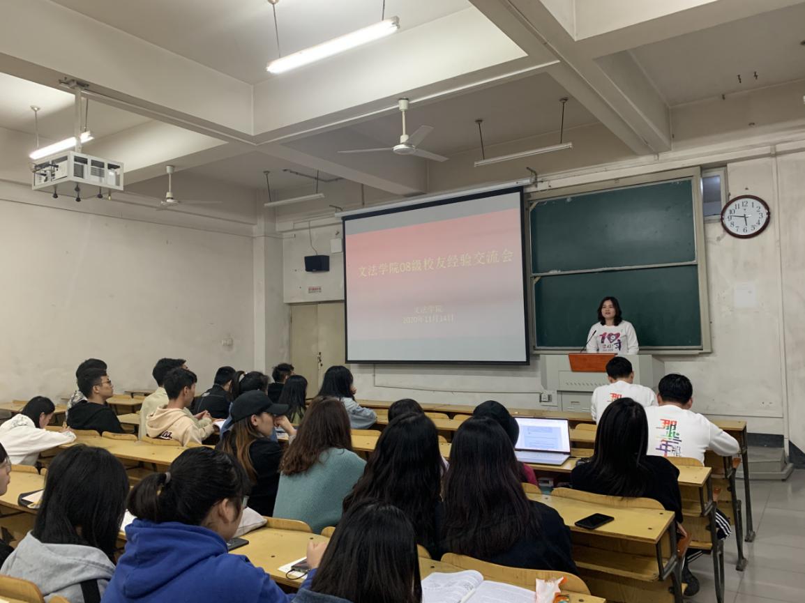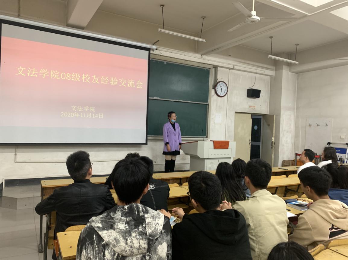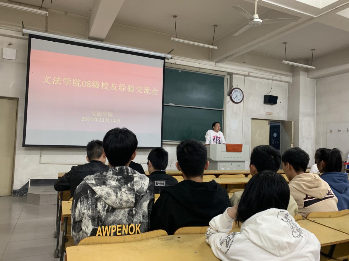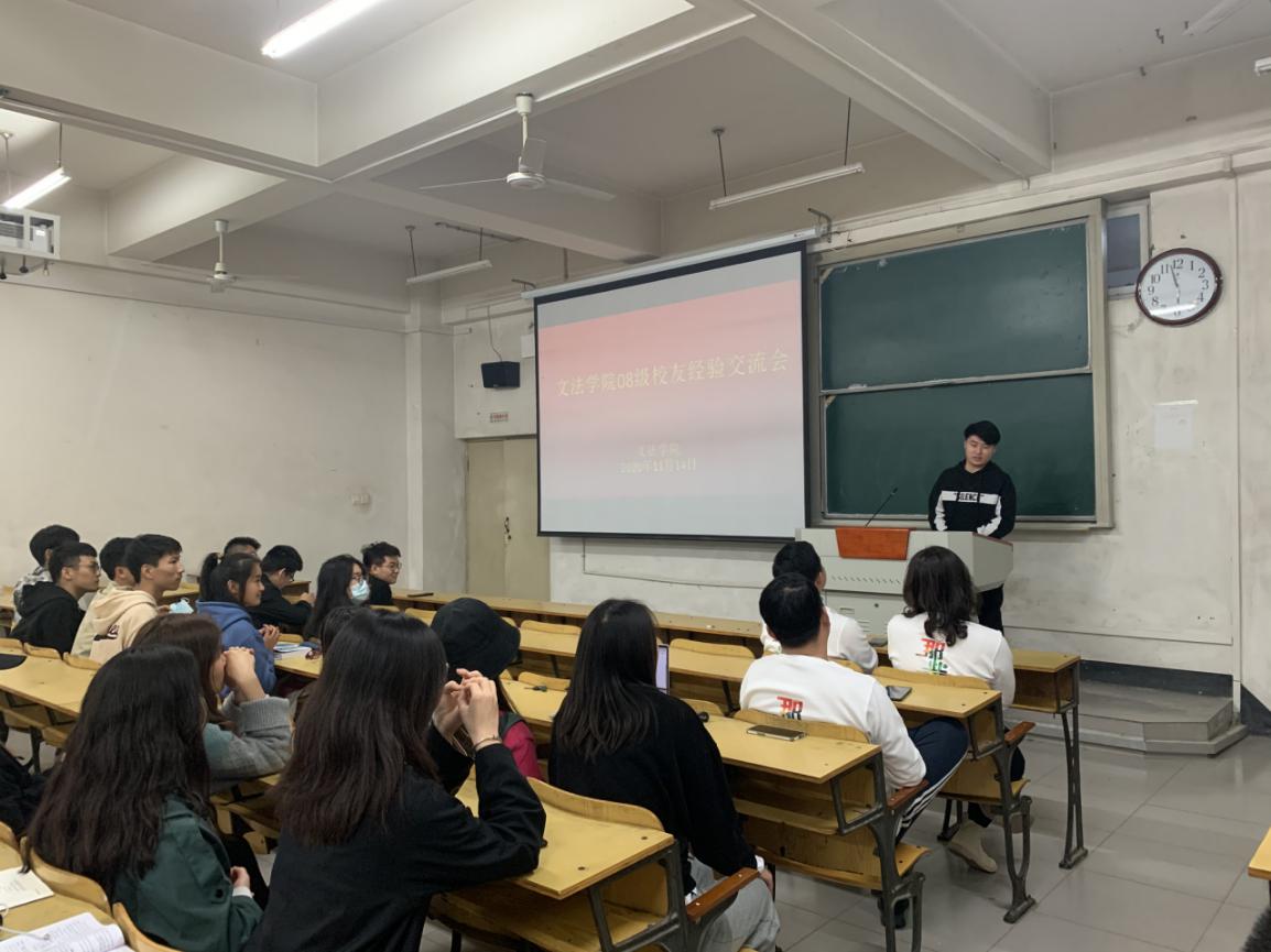 11月14日下午,郑州航院best365中国官方网站0808961班校友返校,优秀校友工作学习经验交流会在南校区B102教室举行。优秀校友代表北京市中闻(郑州)律师事务所律师钱幸军、河南永城市政府陈芳分别向南区专升本学生代表分享工作学习经验,大会由刘朋鑫主持。