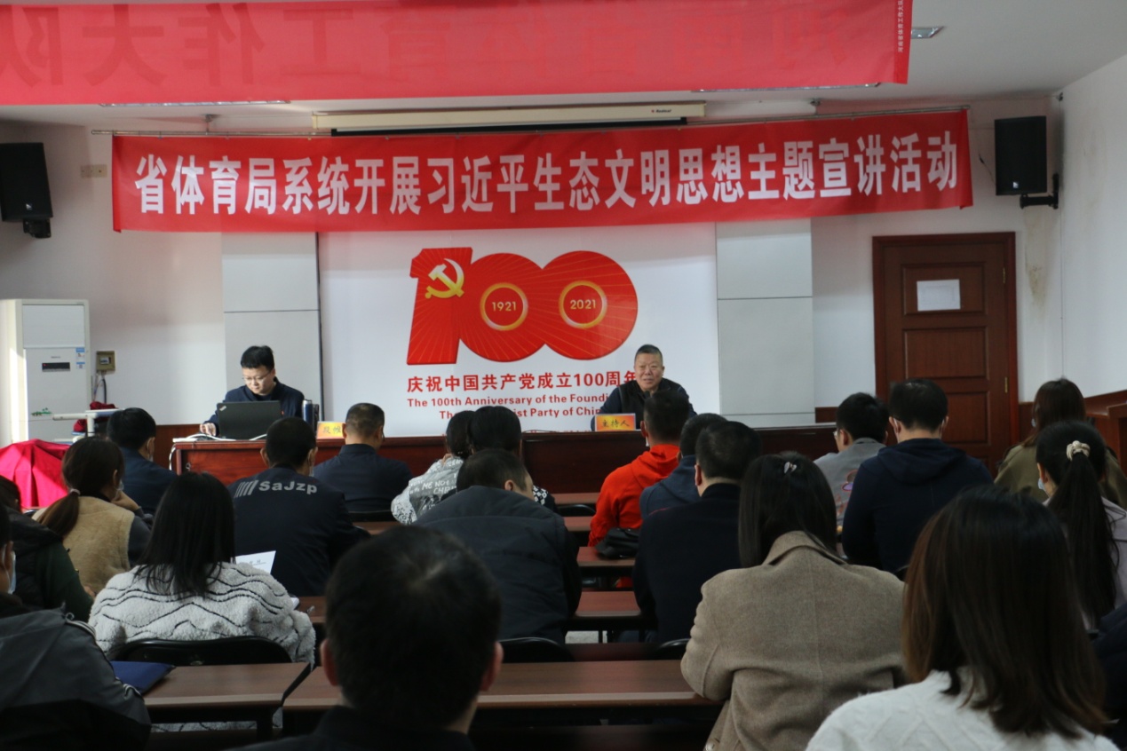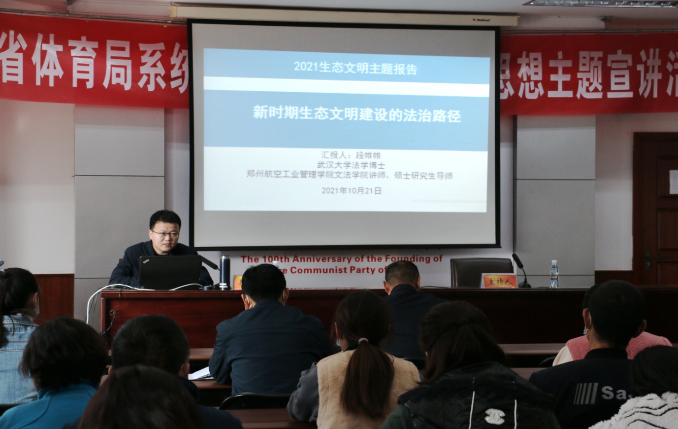 2021年10月21日上午,受河南省体育局机关党委邀请,best365中国官方网站教师段帷帷博士在河南省体育局以《新时期生态文明建设的法治路径》为题,进行习近平生态文明思想主题讲座。本次讲座由省体育局机关党委书记李健主持,省体育局机关党委及局系统干部职工共50余人参加此次讲座。