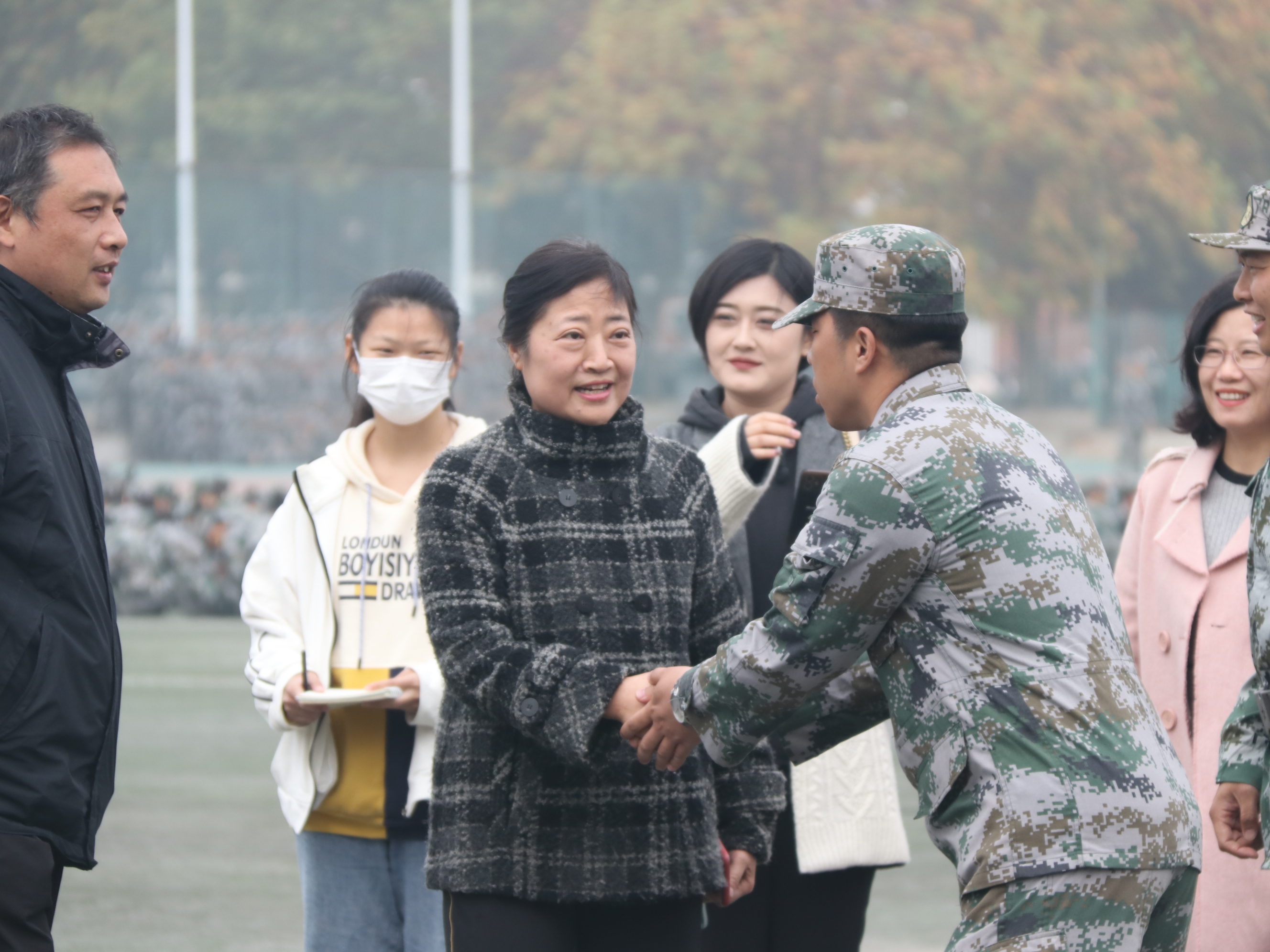 2021年11月1日上午,党委书记杨欣欣,党委副书记赵耀、分团委书记尚福星、学工办主任薛志娟以及20级辅导员郑琛等一行人深入新生军训场地,亲切慰问军训教官和2021级全体新生。全体新生列出整齐的方阵,以热烈的掌声欢迎学院领导和老师的到来。