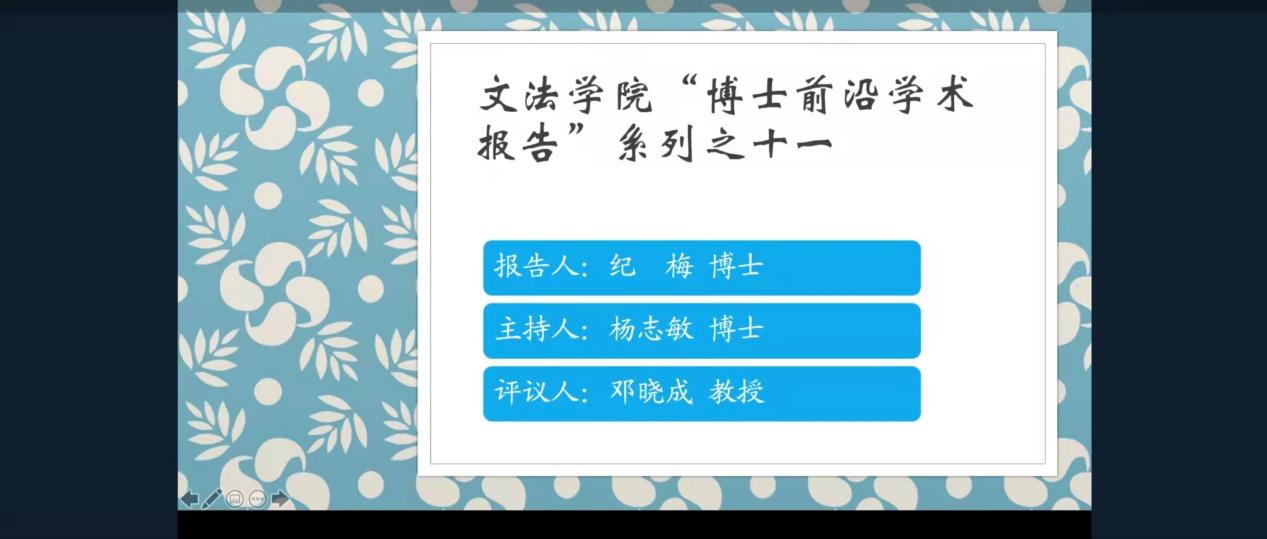 会议伊始,李纪梅博士从“诗歌与反城市情结”方面出发,引用古籍和古代著名诗人杜牧等人的作品讲解了“城市”的含义和古诗文中的城市书写。随后,李纪梅分析了“中国新诗中的城市书写类型”,并引用多位现当代诗人的作品简单讲解了民族化书写、阶层化书写、自然化书写这三种书写类型,从而深入介绍中国城市诗歌的发展历程。最后,李纪梅从“作为景观的器物”和“日常生活的诗意”两个部分讲解“作为风景的城市书写”,她引用黄灿然等当代诗人的作品,将中国诗歌中的城市书写复杂的发展历程和独特魅力展现得淋漓尽致。