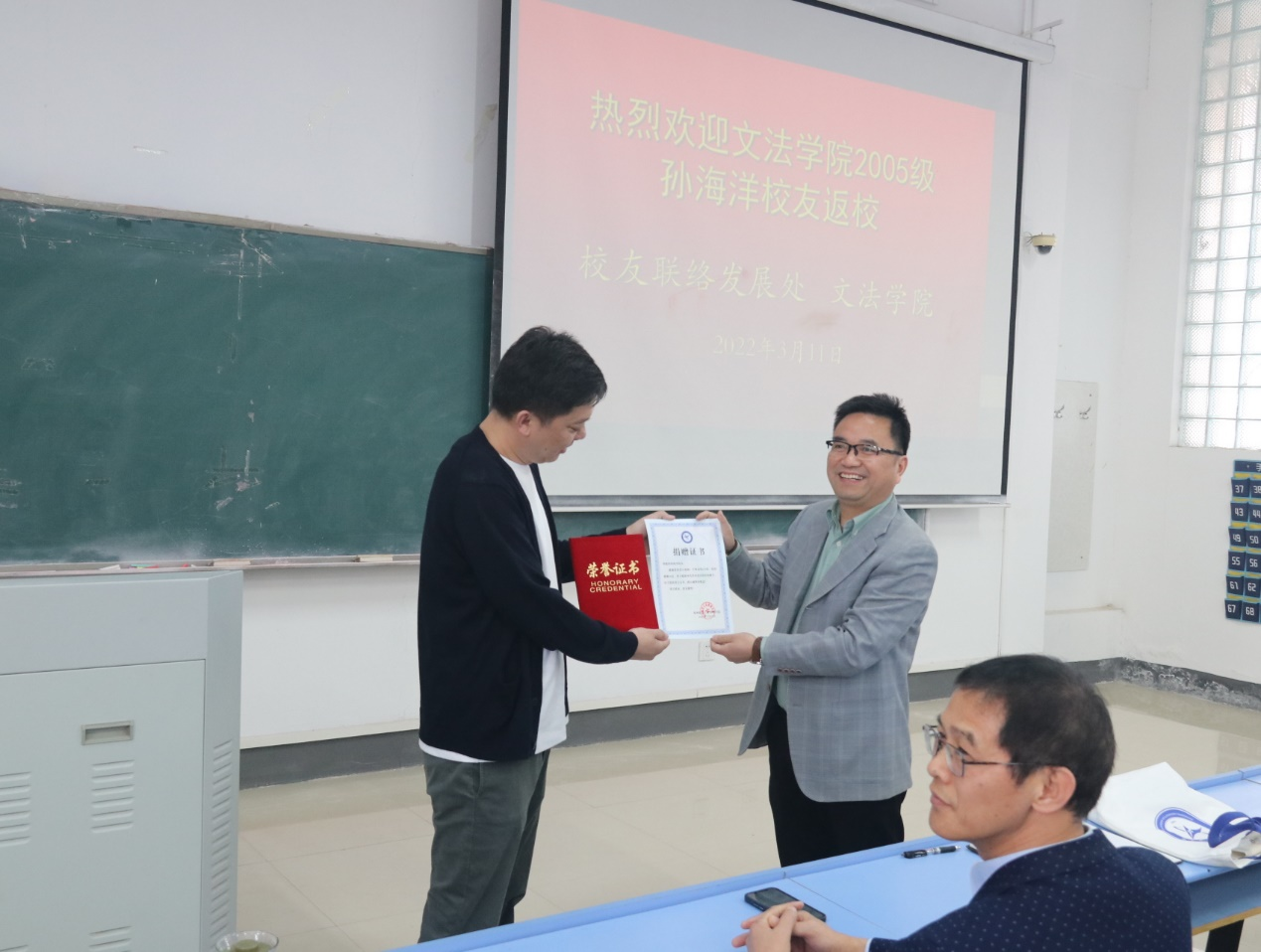 首先,学校校友处长李胜伟向孙海洋颁发荣誉证书,他表示,孙海洋能心怀感恩,在母校需要帮助时伸出援手,雪中送炭,实在让母校感到欣慰。而且他离开母校后,依然积极进取、自主创业,是历届校友中的先锋与榜样,母校以他为荣,希望同学们能够学习孙海洋的进取精神,共创高质量大学。随后,孙海洋发言,他强调了学习的重要性,并讲述了自己的学习经历,还和同学们分享了不少工作经验以及“7.20”后自发支援母校的感慨心得,他提到,在校的丰富生活帮助他更好地适应了社会,十分感谢母校的栽培,希望能为母校尽自己的绵薄之力,愿母校能越办越好。同时,他将“天道酬勤、地道酬善、人道酬和、商道酬信、业道酬精”这句话送给同学,鼓励大家珍惜时光,发奋读书,常怀感恩之心,不忘母校。