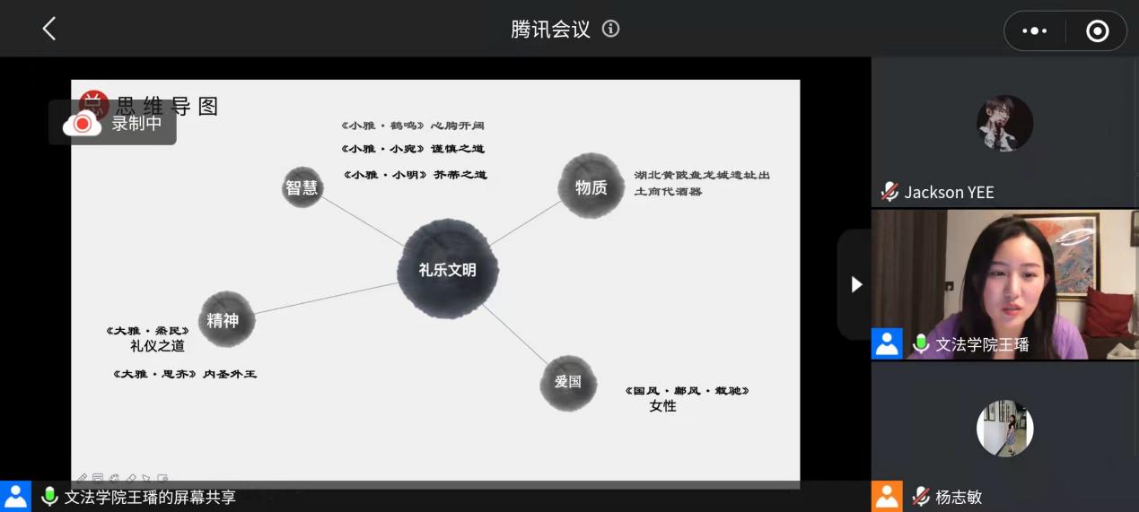 报告会中,王璠博士展示了多张在《诗经》中出现过的青铜器出土文物的照片,一起窥探中国古代礼乐文明的真实面貌,令我们对礼乐文明有了更深刻的认识。王璠博士以《大雅·烝民》《大雅·思齐》等诗歌为例讲解了周人“德”的观念以及“内圣外王”的精神,展现了《诗经》在建构商周礼乐文明中的重要作用。同时对于诗歌《小雅·鹤鸣》《小雅·小宛》《小雅·小明》中展现出的心胸开阔、芥慎之道等大智慧进行赏析。随后通过诗歌《鄘风·载驰》了解诗歌中的爱国主义精神。报告临近尾声之时,王璠博士推荐了一些书目为未来希望对《诗经》有所研究的同学提供了帮助,并为报告会画上了完美的句号。