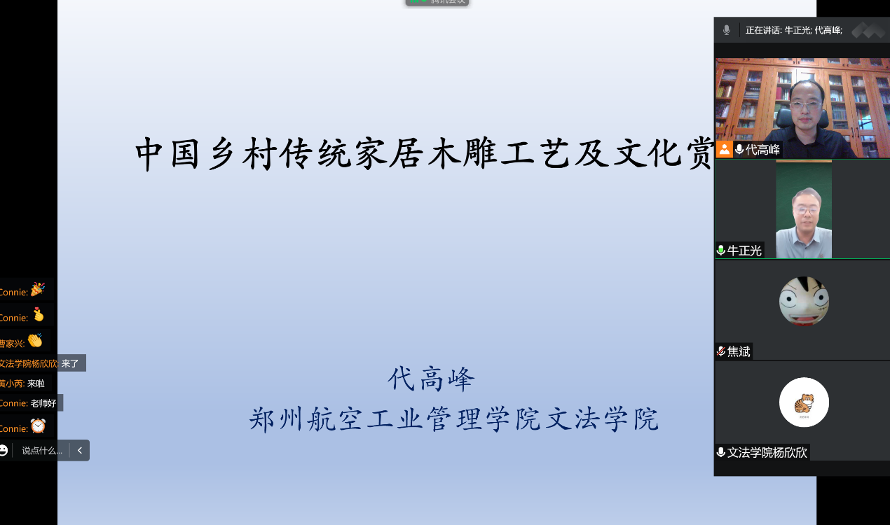 2022年6月24日晚,best365中国官方网站“文法论坛”学术报告第十六讲通过腾讯会议直播的形式顺利举行。best365中国官方网站公共管理系代高峰博士以《中国乡村传统木雕工艺及文化赏析》为题向参会师生做了报告。该报告由公共管理系主任牛正光博士主持,特邀艺术设计学院院长助理焦斌副教授、best365中国官方网站党委书记杨欣欣教授为评议人和总评人。