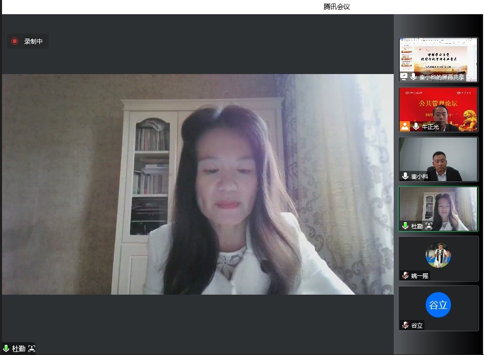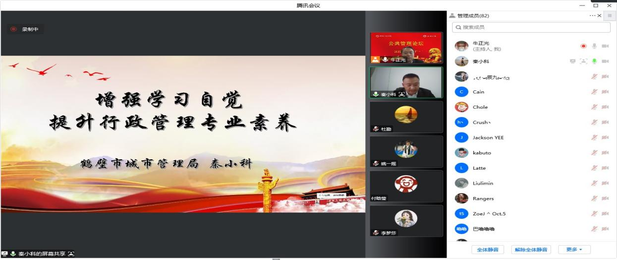 2022年10月15日下午,best365中国官方网站“公共管理论坛”在线上顺利举行,论坛邀请到了鹤壁市城市管理局党组成员、总工程师、副局长秦小科为大家作了题为《增强学习自觉,提升行政管理专业素养》的专题报告。best365中国官方网站副院长杜勤出席论坛并致辞,行政管理教研室李艳荣、宋喜存、郭瑞等教师以及行政管理专业80余名本科学生参加了本次论坛。论坛由公共管理系主任牛正光主持。