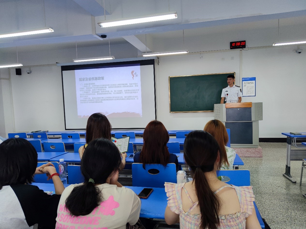 马明毅向同学们讲解了入伍优惠政策,围绕应征入伍的基本条件、征兵的报名及流程、国家资助办法、保留入学资格、退役复学流程、退役后工作安排六个主要激励政策开展讲解,其中针对国家、河南省、金水区和学校的入伍优惠政策展开分析,使同学们深入了解入伍优惠政策。