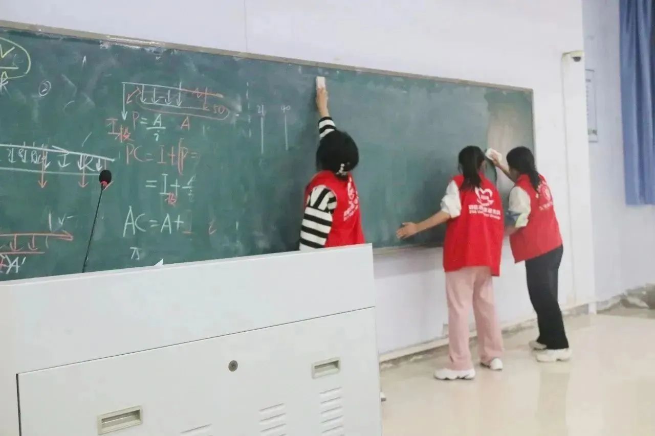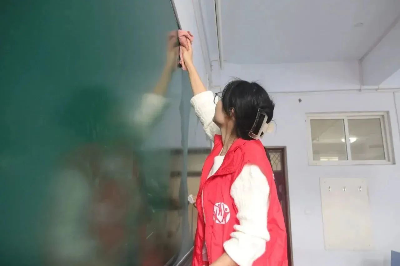 秉承着“认真负责、不怕脏、不怕累”的精神,大家按照预先划分的区域以及工作任务对教室的讲台、桌面以及墙角的垃圾杂物,特别是卫生死角的灰尘和蜘蛛网等进行彻底清洁。大家对讲台进行整理归纳,用干纸巾拂去灰尘。面对字迹满满的黑板,志愿者们分工协作,先用黑板擦将黑板上的字迹擦除,紧接着用搓洗好的抹布将板面的粉尘擦净,最后用干抹布去除水痕,做到黑板不留痕。同时将黑板底部易堆积粉尘的凹槽一并清理干净。
