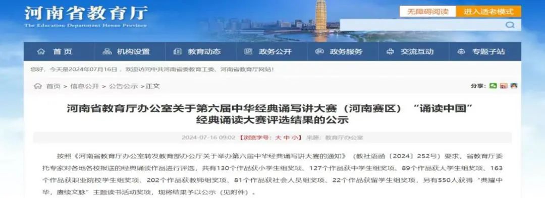 根据教育部办公厅《关于举办第六届中华经典诵写讲大赛的通知》(教语用厅函〔2024〕2号)要求,在第六届中华经典诵写讲大赛“诵读中国”经典诵读大赛中,我校师生荣获教师组一等奖2个,大学生组二等奖1个,三等奖1个,留学生组二等奖1个,三等奖1个。我校自参加中华经典诵写讲大赛以来,连续六年斩获佳绩。
