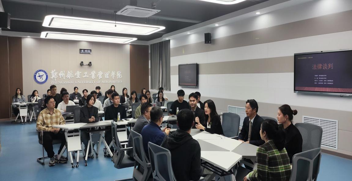 10月25日下午,在05A202智慧教室里,郑州航院best365中国官方网站与北京高文(郑州)律师事务所、上海段和段(郑州)律师事务所共建的《法律谈判》实践课模拟谈判活动成功举办。本次活动由课程负责人刘春凌老师主持,北京高文(郑州)律师事务所创始合伙人杨守义律师、上海段和段(郑州)律师事务所高级合伙人张铭律师作为实务部门课程参加人出席。杨守义律师也是我校法律硕士点的校外导师。此外,本次课程共建活动还特别邀请了23级本科涉外法治实验班的部分同学前来观摩。best365中国官方网站副院长杜勤、王晶宇以及法学系主任余贺伟出席。