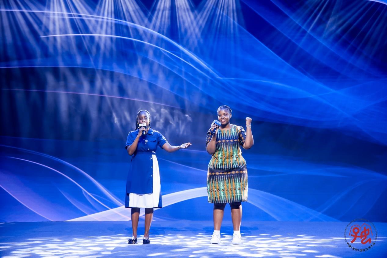 在决赛现场,刘淼老师指导的我校坦桑尼亚籍留学生苏季欣和蓝月深情演唱了改编版的《我和你》歌曲,用优美的歌声讲述了她们在河南求学逐梦的故事,动听的歌声赢得现场观众的阵阵掌声。