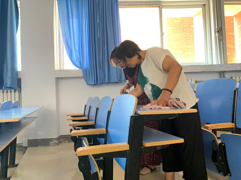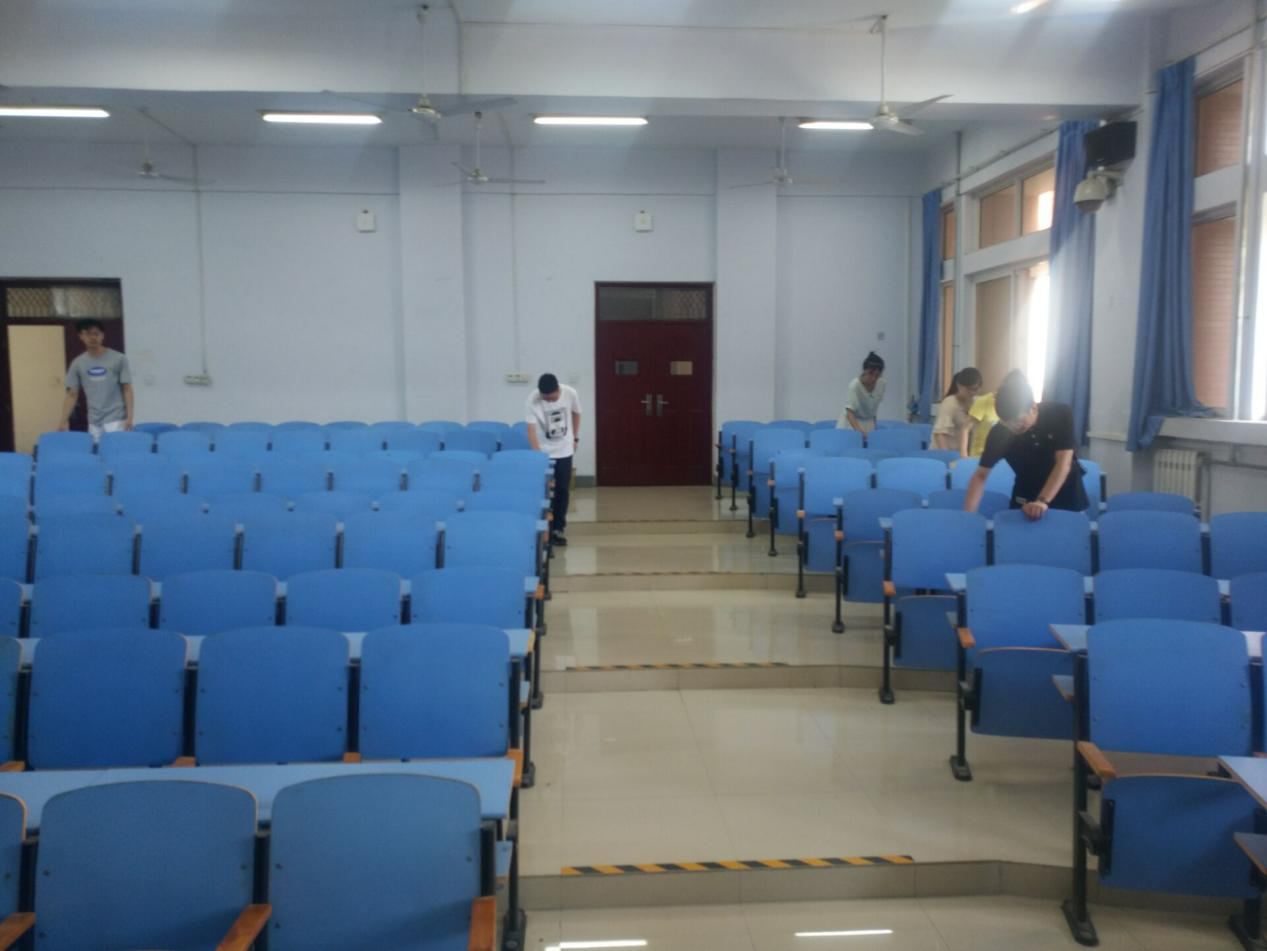 上午九时,26名学生党员在05教学楼集合完毕。成员共分为三个小组,分别负责每一层楼A、B、C座的所有教室的书桌。擦洗过程中,大家认真细致,不仅擦桌面,也将教室黑板等其他相关物品也擦得很洁净。遇到有些桌面很难擦干净的,也不轻易放弃,想尽办法,尽可能让桌面恢复清洁的本貌,大家的义务清洗活动感动了教学楼的清洁阿姨,阿姨教会了大家更便捷的清洗方法。在清洗过程中,大家不但认真仔细擦拭,而且充分站在同学们的立场上,牢记服务理念,遇到教室可能有人自习的,大家都静悄悄地,只能听到抹布擦桌子的簌簌声。
