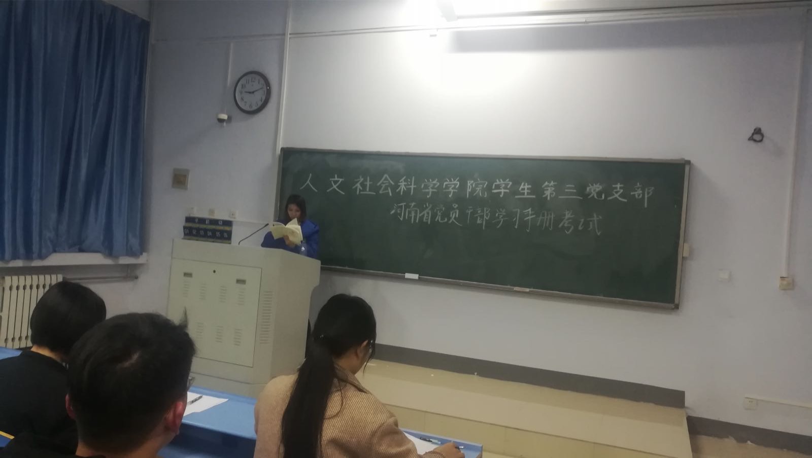 最后,学生三支部在团总支书记刘爽带领下,开展了党员干部学习手册考试。本次考试由团总支书记刘爽出题,考试过程中全体党员认真对待,仔细答题,也展现了大家用心学习政治理论知识的积极性和热情。