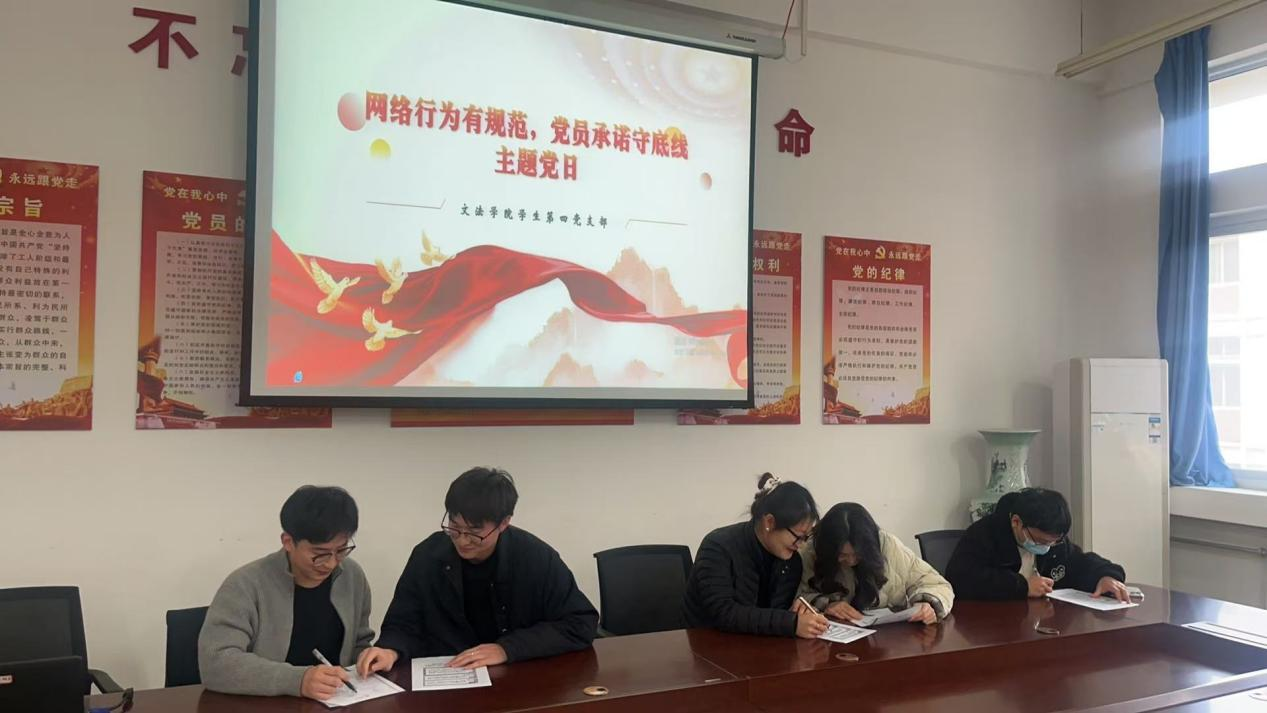3月14日下午,学生第四党支部举行“网络行为有规范,党员承诺守底线”主题党日,并签署承诺书,时刻牢记党员身份