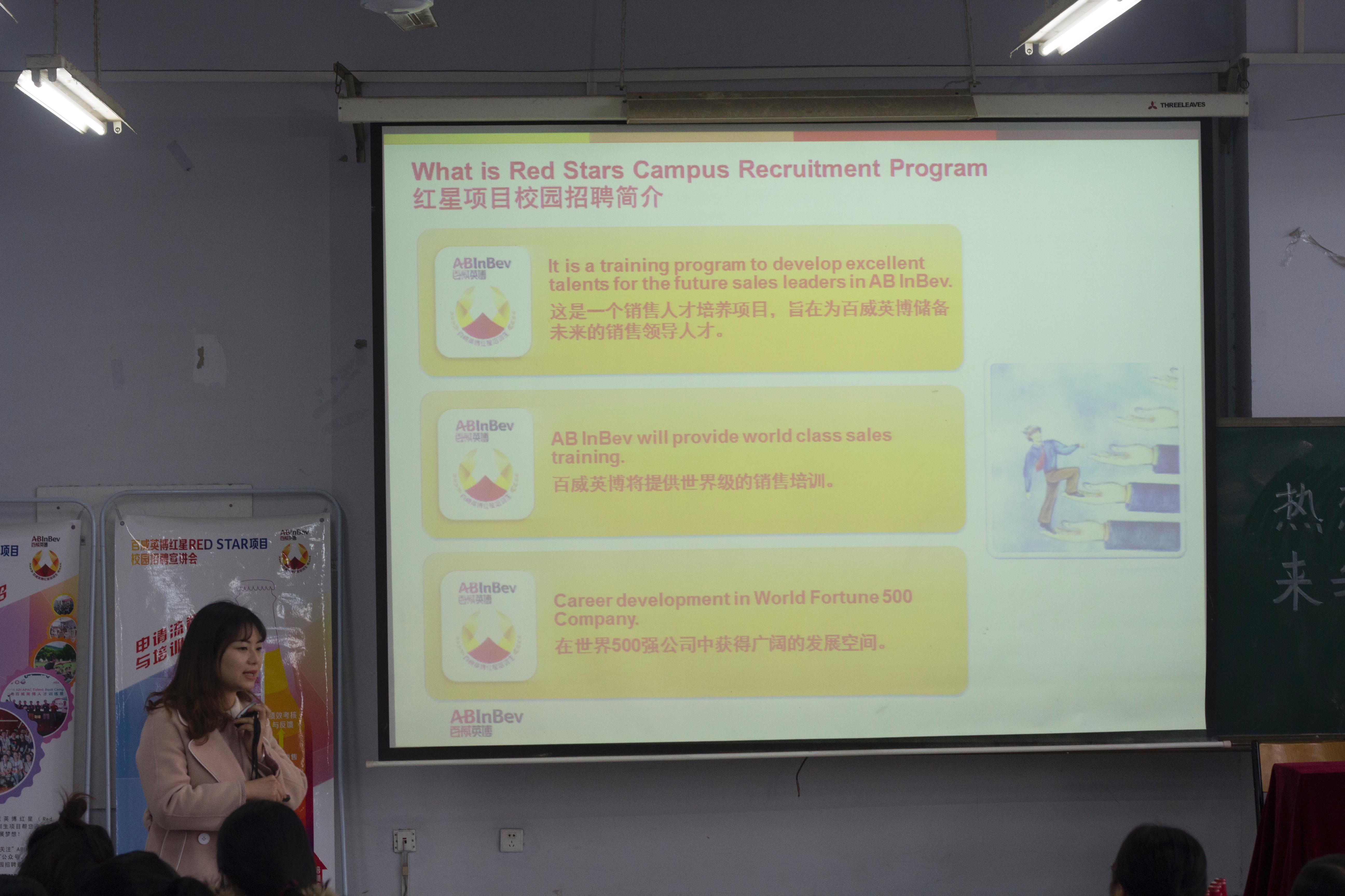 招聘会上,首先四个公司代表通过PPT展示、播放宣传片、展书等形式轮流介绍了公司的企业文化、未来发展方向和岗位人员需求等。接着公司代表们又各自介绍了同学们关注的薪资待遇和福利问题。随后best365应聘求职生开始给感兴趣的用人单位投递简历,面对面和公司负责人交流、面试。最后同学们还试饮了百威英博的酒品,真实的感受了他们的产品。