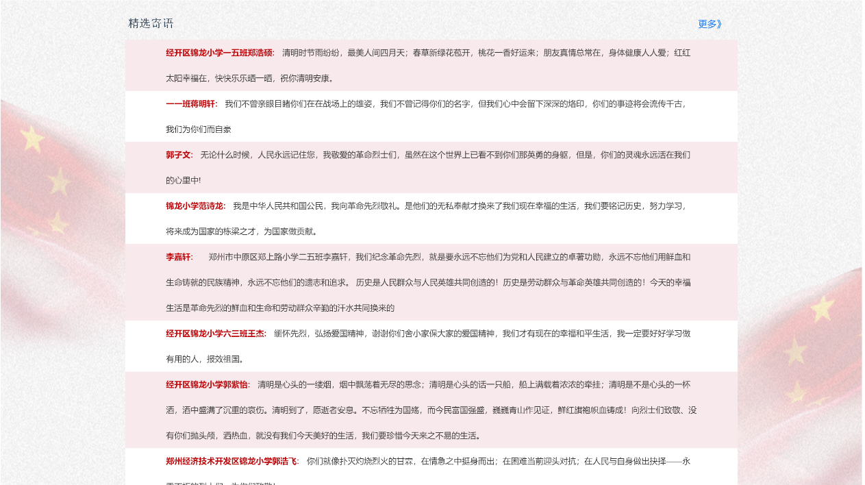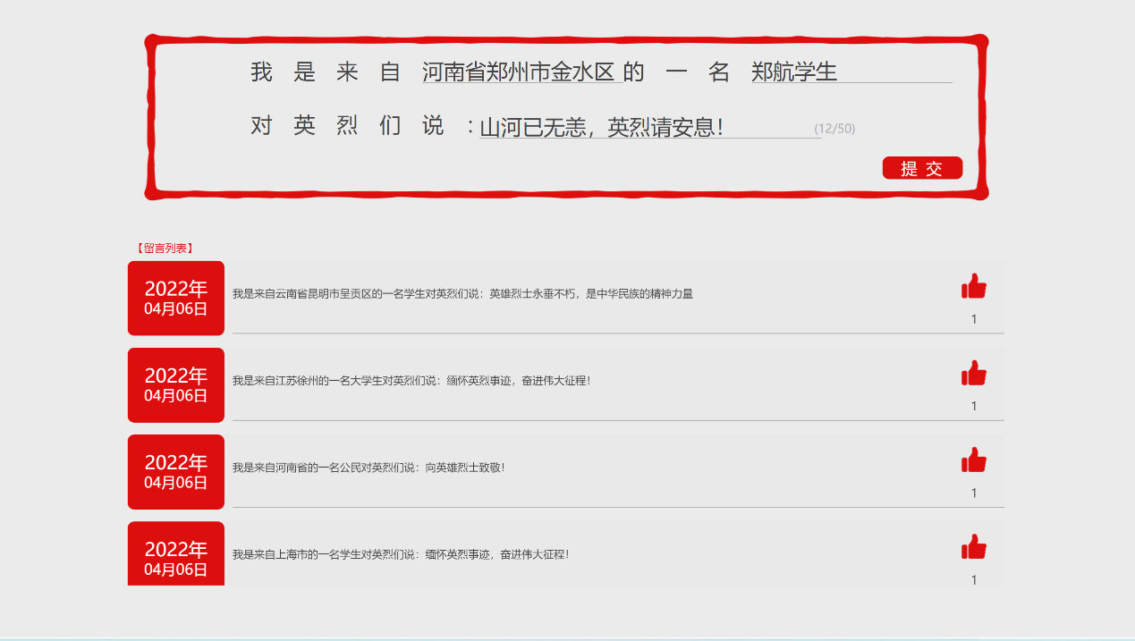 忆革命先烈,述爱国衷肠。为给学生提供一个寄托哀思的方式,了解更多革命先烈的英勇事迹,考虑到当下疫情形势,我校特举办以“缅怀先烈,致敬英雄”为主题的云祭祀活动。此次云祭祀活动共有包括登陆中华英烈网,选择英烈进行献花在内的四种祭祀方式。同学们在对先烈的留言中追忆了革命先烈的英雄事迹,抒写了对革命先烈的无限哀思和崇高敬意,表达了新一代青年追寻革命先烈足迹、实现中华民族伟大复兴的心声。此次活动缅怀了革命先烈舍生忘死、振兴中华的英雄气概和鞠躬尽瘁、一心为民的高尚情操,勉励大家倍加珍惜先烈用生命换来的和平幸福生活,勤奋学习,不断奋进。