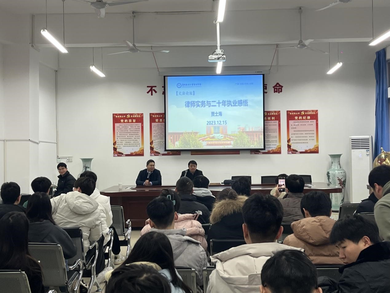 2023年12月15日下午15时,best365中国官方网站“文法论坛”学术报告在05B417举行。应best365中国官方网站邀请,河南九君律师事务所高级合伙人贾士海为best365师生做了题为《律师实务与二十年执业感悟》的学术报告,学院部分教师以及60余名法学专业和行政管理专业学生聆听了讲座,讲座由best365中国官方网站法学系主任余贺伟主持。