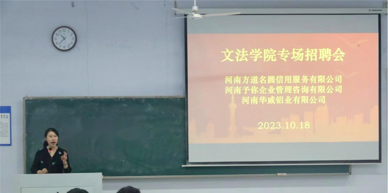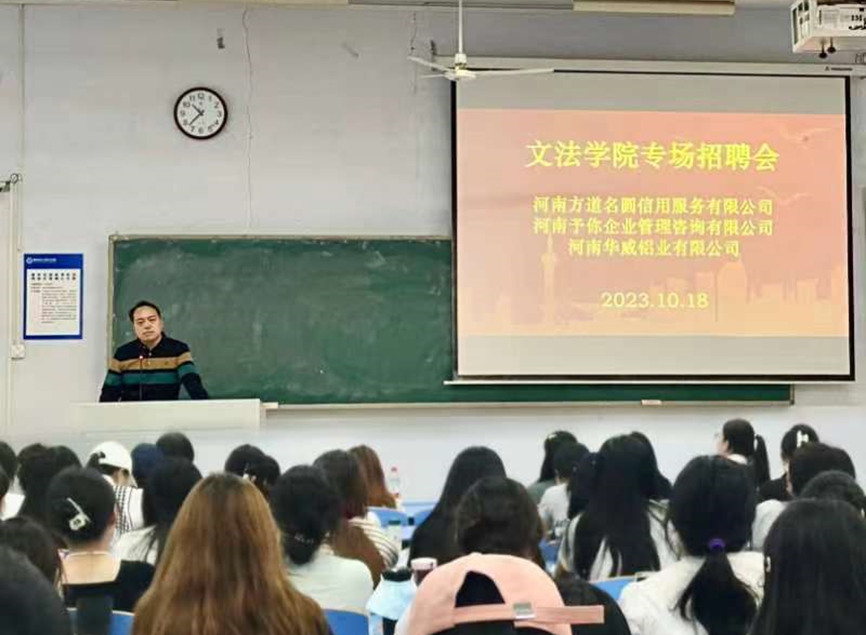 本次招聘会邀请了河南方圆信用服务有限公司、河南予你企业管理咨询有限公司、河南华威铝业有限公司、河南盛荣税银企业管理有限公司以及郑州新捞派餐饮管理有限公司五家用人单位,其中郑州新捞派餐饮管理有限公司是与我校建立长期合作关系的校友企业。各公司代表分别向参加招聘会的学生介绍了公司概况、公司业绩、发展前景,补充说明了人才需求与培养、薪酬福利待遇等内容,并针对学生关心的问题给予了明确的回应。