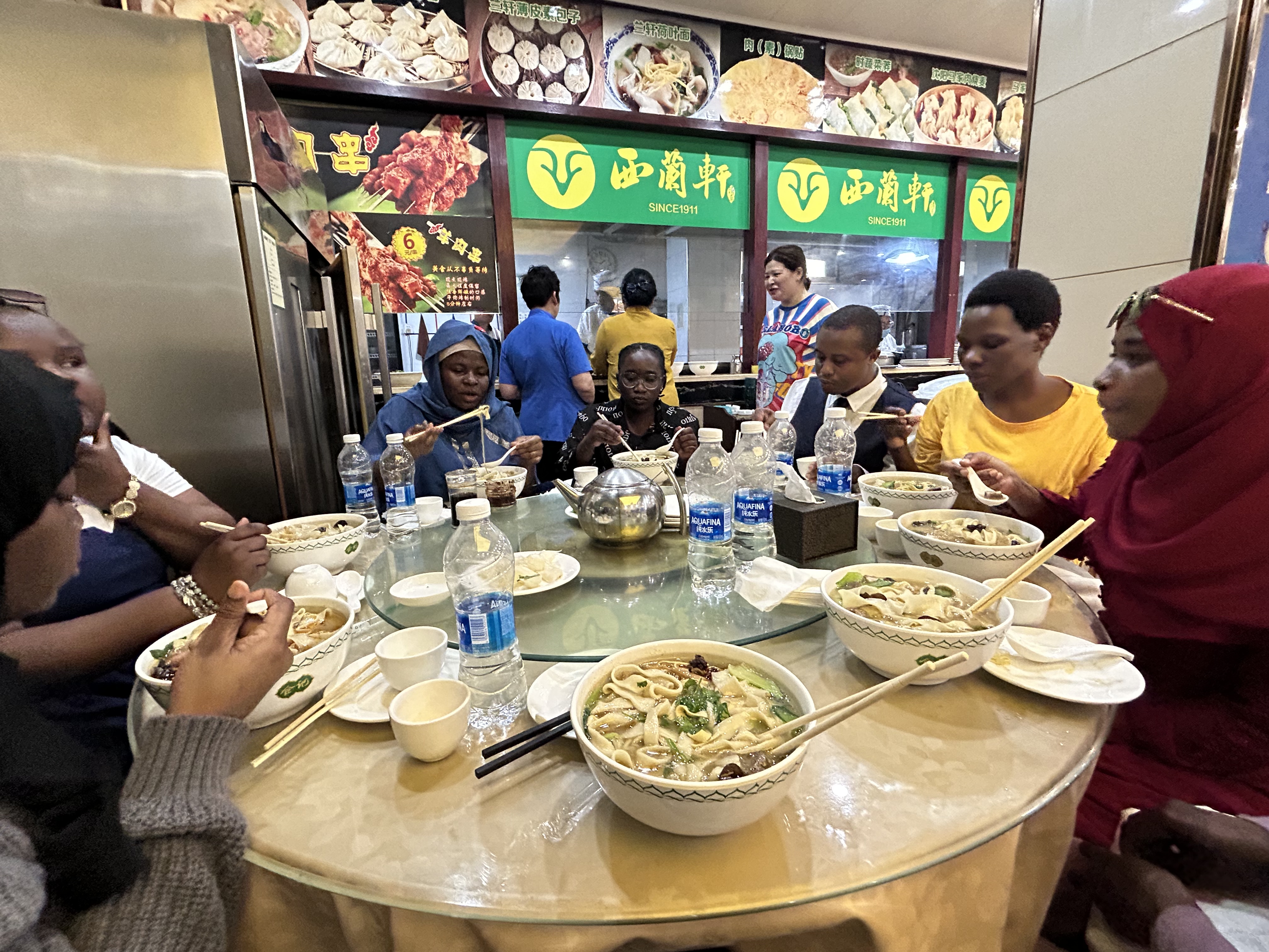 参观活动结束后,大家一起品尝非物质文化遗产——烩面。老师们详细介绍了烩面的起源、制作工艺以及蕴含的文化意义。烩面师傅熟练的抻面手法与由十三种香料熬制而成的醇厚汤底和六种新鲜且丰富的配料完美结合,让中外学生亲眼见证了一碗烩面的诞生。留学生们更是大快朵颐,赞不绝口。