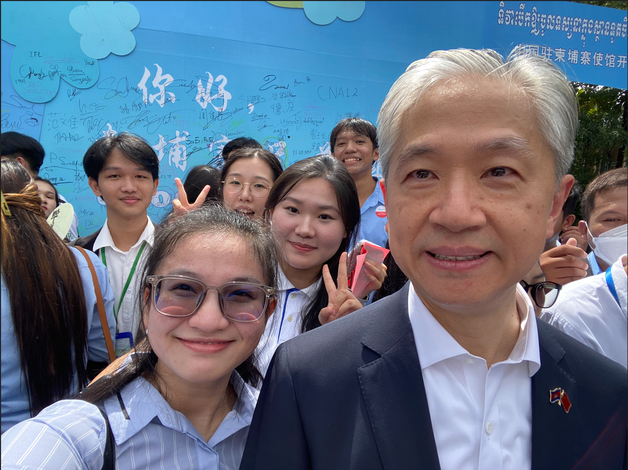 作为老师,那天我们和学生一起享受中国美食,参加知识问答、潮玩打卡、汉服书法、体育竞技等活动,处处欢声笑语,气氛热烈友好。在听完汪文斌大使讲解中柬友好交流历史后,我们一起进行集体合照。