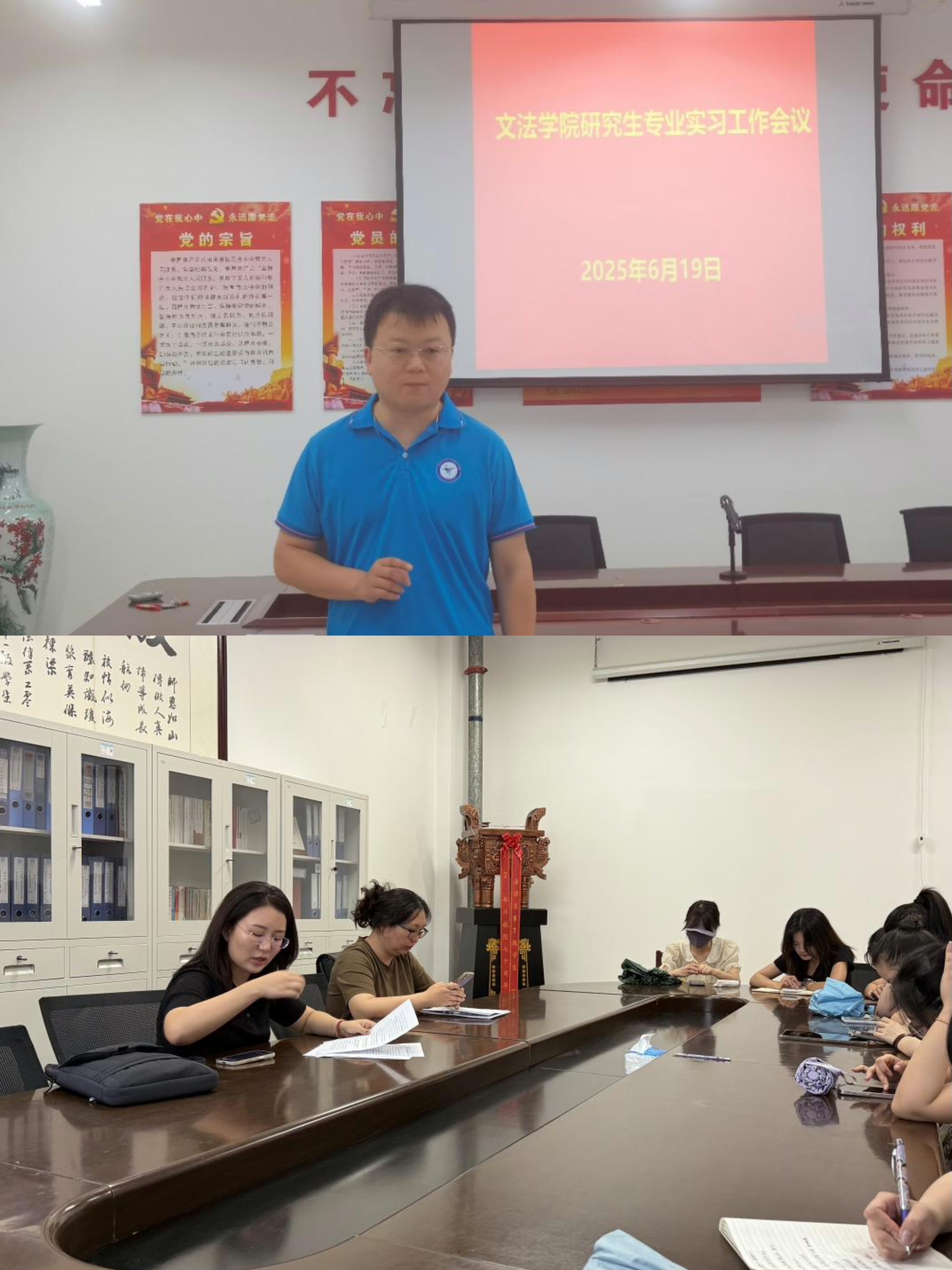 2025 年 6 月 19 日,best365中国官方网站在05B417室召开研究生培养工作会议。院长邓晓成、副院长杜勤、负责研究生实习工作的段帷帷老师和王璠老师, 2023 级法律(非法学)、2024 级法律(法学)和国际中文教育研究生参加。会议由学研办王延霞主持。